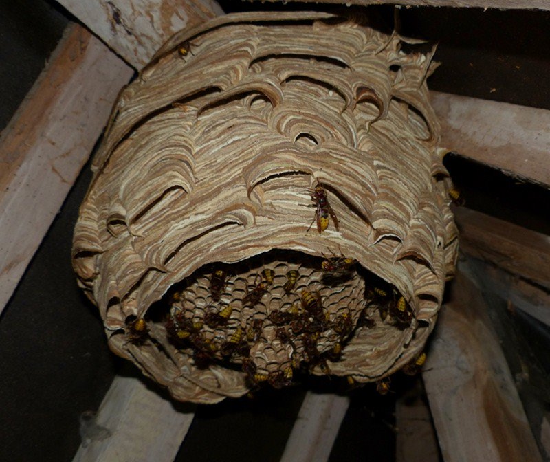 Il s’agit d’un nid en forme boule s’apparentant à du carton. De la taille d’un ballon de hand-ball en début de saison, pour finir haut de 80cm, avec 60cm de diamètre en fin de saison. Un nid de guêpes ou de frelons est de couleur marron, à l’entrée unique, sur le côté pour les guêpes et le frelon asiatique, et en dessous pour le frelon européen. Mais le plus souvent, seul les allées et venues des hyménoptères sont visibles. En effet, ils construisent leur nid à l’abri, dans une toiture en profitant d’un écart de tuile, dans un appentis ou une cabane de jardin, dans une cheminée, un chien-assis, un vide sanitaire, en terre entre les racines ou profitant d’un creux, etc…bref, dans tous les endroits à l’abri des regards. A la pleine saison, un nid de guêpes ou de frelons peut contenir jusque 2000 individus.